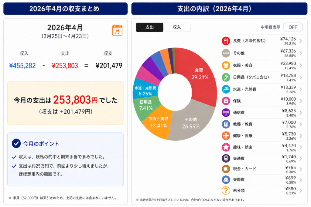 外食も控えめにして、無駄遣いもしていないつもりでしたが、実際の支出を見て少し驚きました。